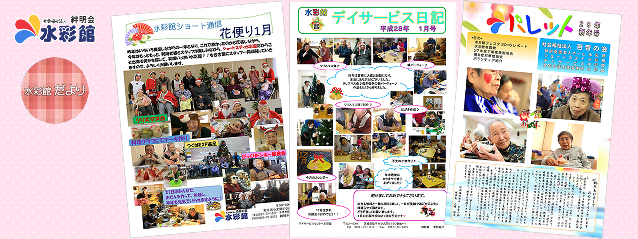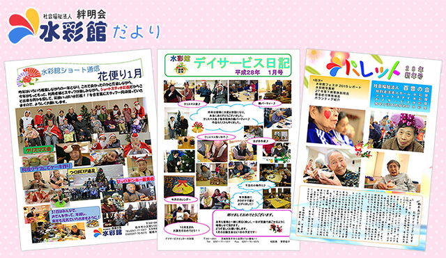 水彩館では、ご家族のみなさまに日常をお伝えすべく、広報誌を発行しております。